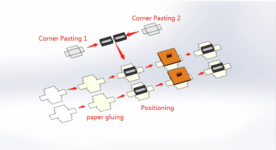 Automatic double rigid box visual positioning machine PC-800A adopts double servo mechanical feeder,double paper feeding table,can fix two different box position at the same time. It usually connects with other machine to make fully automatic line. +0.1mm deviation is suitable for high-end box manufacturing.